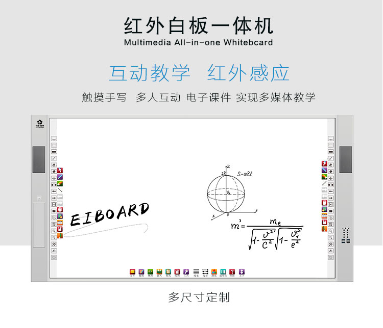 紅外白板一體機集電腦、音箱、展台、智能中控、白(bai)板(ban)於(yu)一(yi)體(ti),采(cai)用(yong)一(yi)體(ti)化(hua)無(wu)縫(feng)拚(pin)接(jie)設(she)計(ji)美(mei)觀(guan)大(da)氣(qi),電(dian)控(kong)展(zhan)台(tai)方(fang)便(bian)收(shou)納(na),紅(hong)外(wai)二(er)十(shi)點(dian)觸(chu)控(kong)滿(man)足(zu)多(duo)人(ren)同(tong)時(shi)書(shu)寫(xie),板(ban)麵(mian)采(cai)用(yong)冷(leng)軋(zha)麵(mian)板(ban)防(fang)撞(zhuang)防(fang)刮(gua),尺(chi)寸(cun)擴(kuo)展(zhan)性(xing)強(qiang),滿(man)足(zu)不(bu)同(tong)教(jiao)學(xue)場(chang)景(jing)需(xu)求(qiu)。